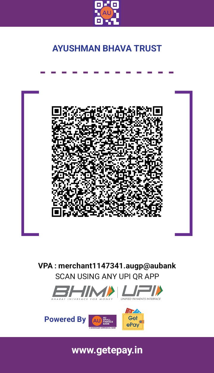 Ayushman bhava trust AU SMALL FINANCE BANK A/C. 2402210456841595 IFSC CODE. AUBL0002104 East Of Kailash New Delhi.